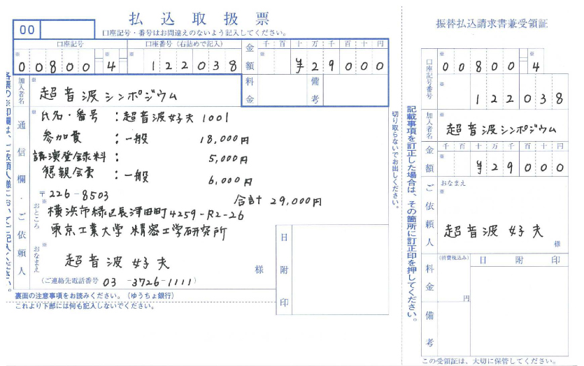 参加費・講演登録料のお支払いの際、1名ごとに1枚の振込用紙をご使用下さい。1枚の振込用紙で複数人分のお振り込みを行わないようお願いいたします。参加者氏名は必ずお書きください。 講演しない場合も会員番号を記入して下さい。 会社などの機関からお支払いの場合、通常参加者と支払いご依頼人が別の方になり、参加者氏名の記入がない場合支払いの確認が困難となります。